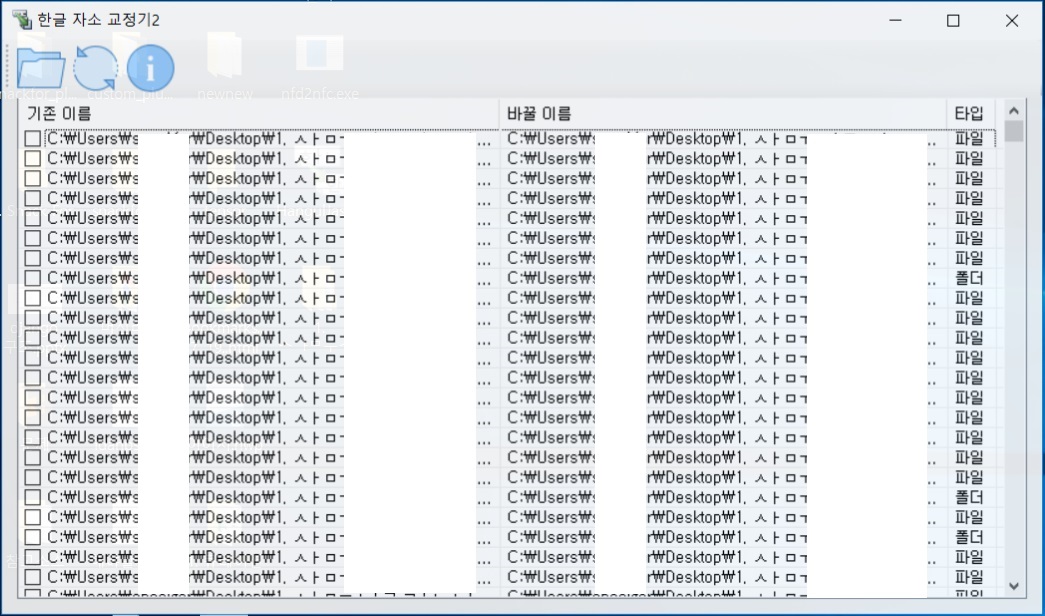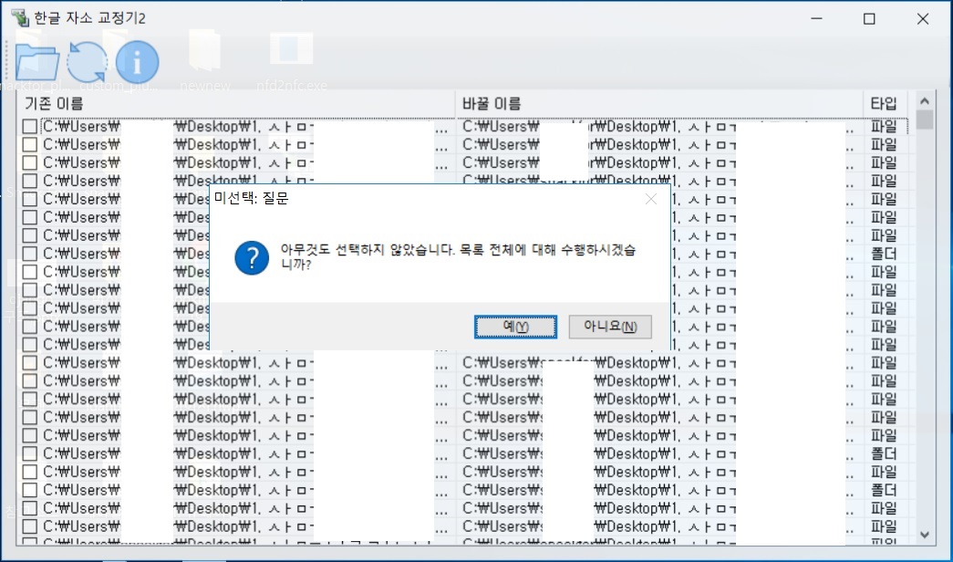 선택한 폴더에서 한글이 깨져있는 (자음과 모음이 분리된) 폴더와 파일들의 목록이 나온다.